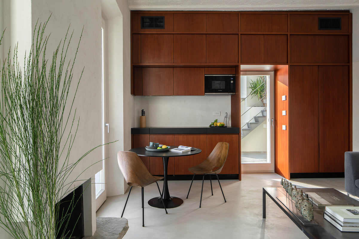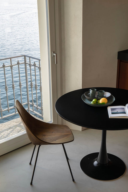Finally, in the kitchen, the collections of crockeries in Limoges porcelain by Society Limonta complement the design pieces of the house with ONDA bowls and BUTO dinner plates in Crab and Fumo shades.