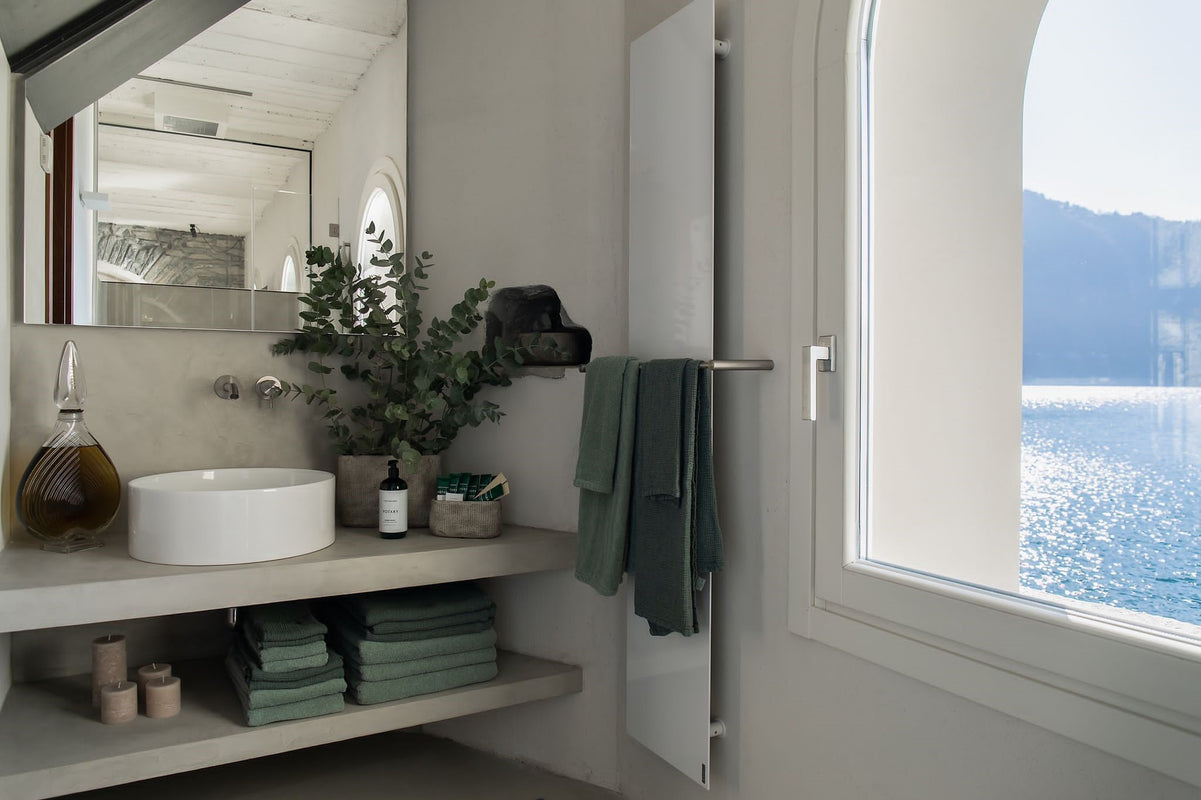 The bathroom is completed with LIPE towel sets in linen and CRISP in cotton, and DRAI bath towels, in pure linen. Both rooms are dressed with a calming, refined taste, establishing a connection between the indoors and the surrounding nature.